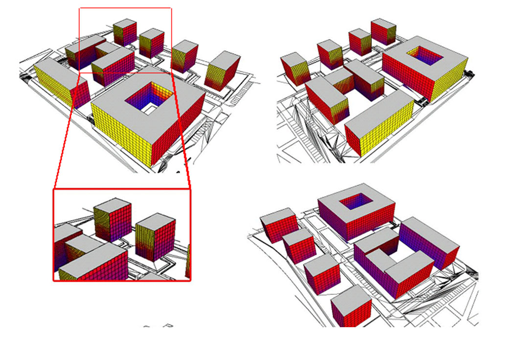 Simulace pasivních solárních zisků a zastínění slouží k optimalizace orientace, stínících markýz nebo žeber budov pro maximalizaci tepelných zisků v zimě a minimalizaci zisků v létě.
